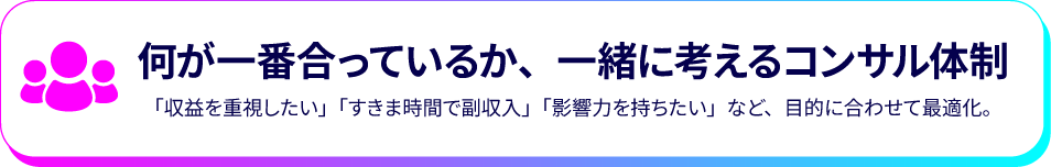 フォロワーが少ない方でも、問題なくご活躍できます。増やし方、戦略についてもしっかりしたサポート体制があるのでご安心ください!